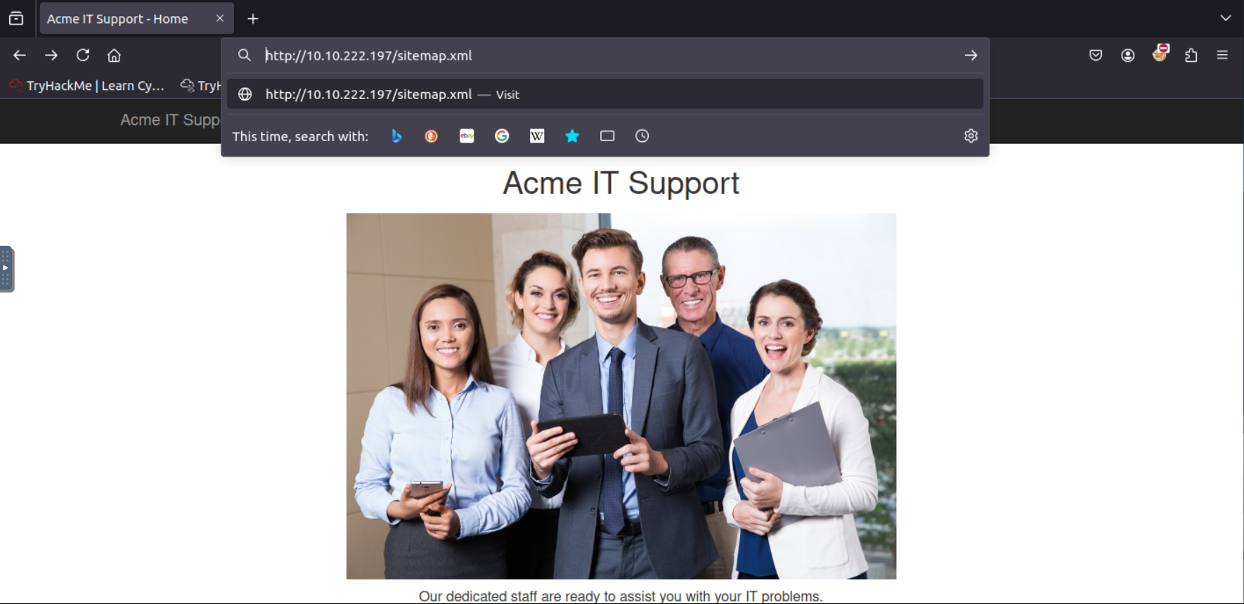 To check the Acme IT Support website’s sitemap.xml, you would open the link in the Firefox browser on the AttackBox. This will show you the list of pages they’ve highlighted for search engines to index. You might discover some hidden content or find out if there’s anything new or outdated.