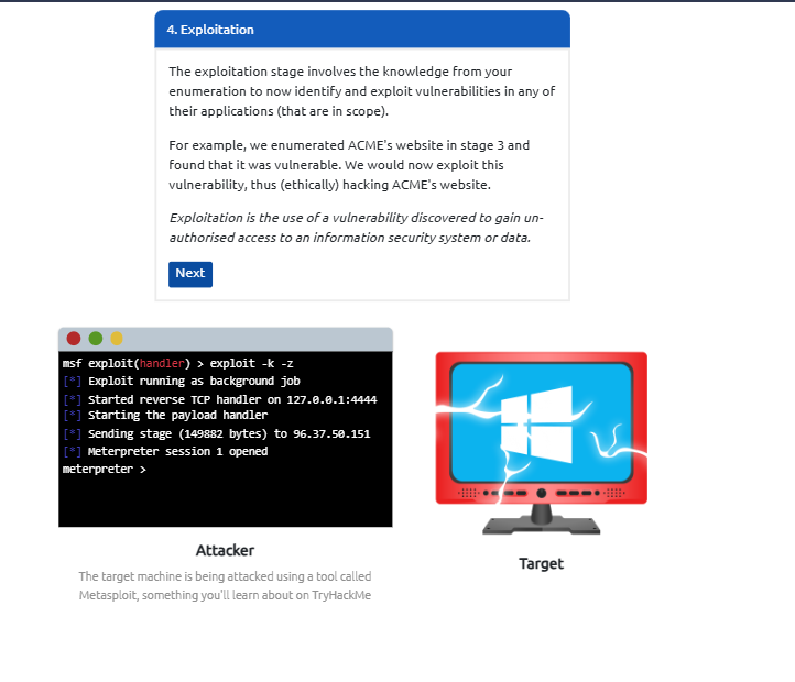 This is where you test the weaknesses you found to see if you can break in. For example, you might use tools or tricks to exploit a security hole in an application.