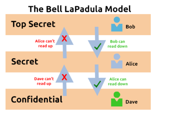 No read down: A user or program can only read data that is at their level or higher. They cannot access or read data that’s less important than what they are allowed to access. For instance, a high-level manager can read a general document, but they cannot read a document meant only for lower-level employees.