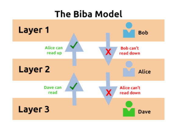 In short, the Biba model is like setting up a hierarchy of permissions where people can only influence or access data at their level or below, but they can only read data above their level to make sure higher-level information stays safe and unaltered.