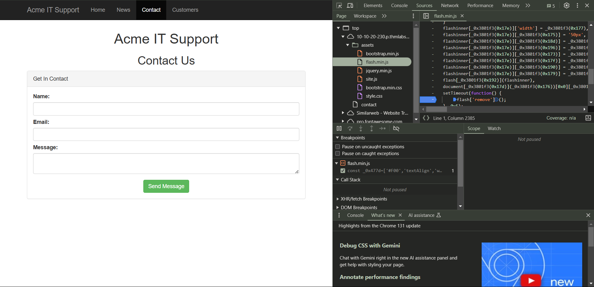 Then head over to source > assets > flashmini.js then scroll down that allows us to view the code that flashes temporarily. Click on the hyphen on that start of the line of code to pause it. It’s highlighted in blue. Then refresh to see the flag